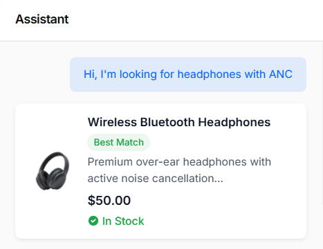 Stop losing sales to bad search. The assistant understands intent, not just keywords, and actually helps people buy.