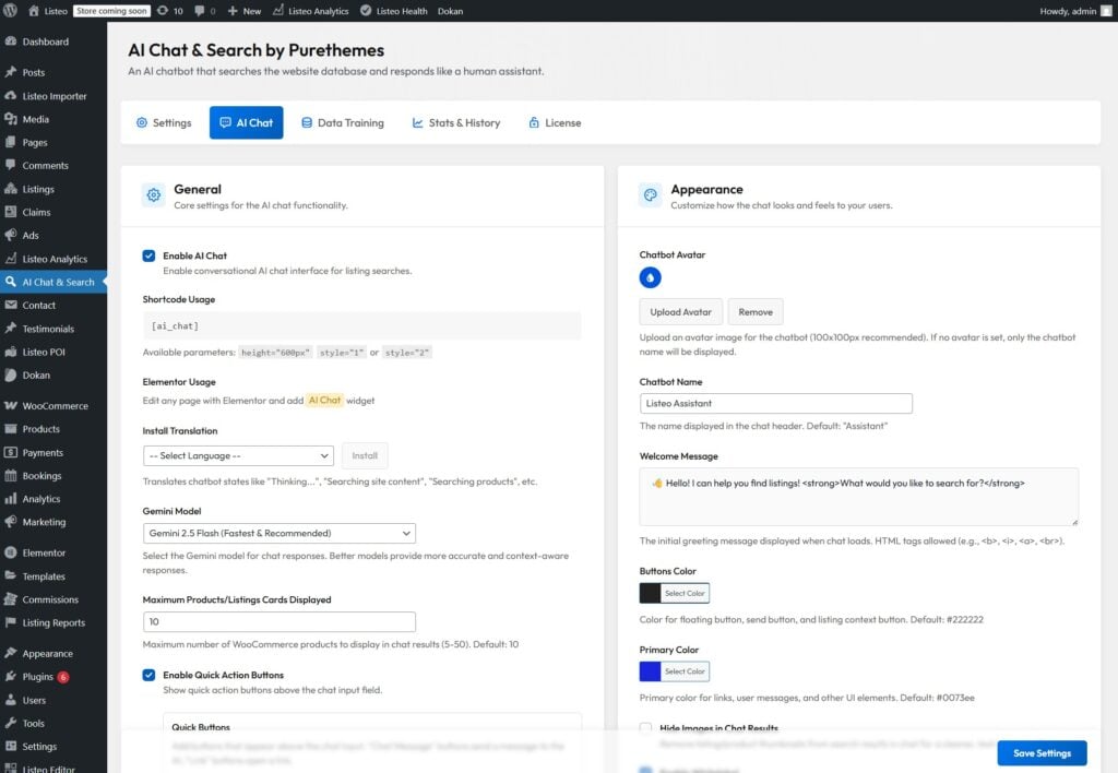 Enable/disable chat, choose AI model (GPT-5.1, GPT-4.1, GPT-4.1-mini and Gemini 3 Pro, 2.5 Pro, 2.5 Flash), set maximum products displayed in results, add quick action buttons above chat input : predefined question to AI, link button (e.g. to a page or whatsapp) and contact form popup) - Appearance