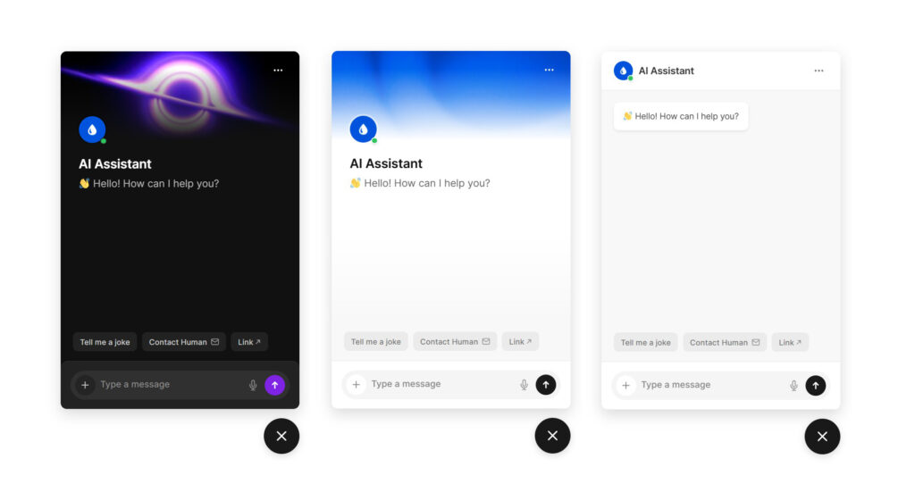 Add a floating chat widget to every page, or embed the chat directly into your content for a focused, full-screen conversational interface.