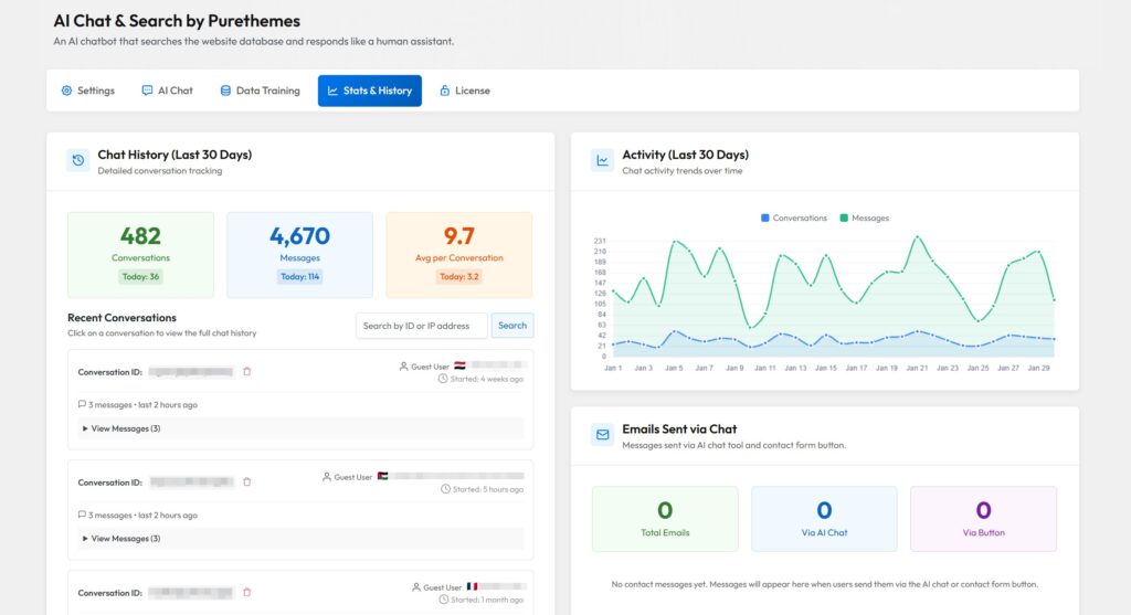 La mayoría de los plugins incluyen analíticas que muestran el número de conversaciones, los mensajes intercambiados y, a veces, el sentimiento. También puedes habilitar el historial de conversaciones para leer los chats reales y ver si los usuarios están obteniendo respuestas a sus preguntas.