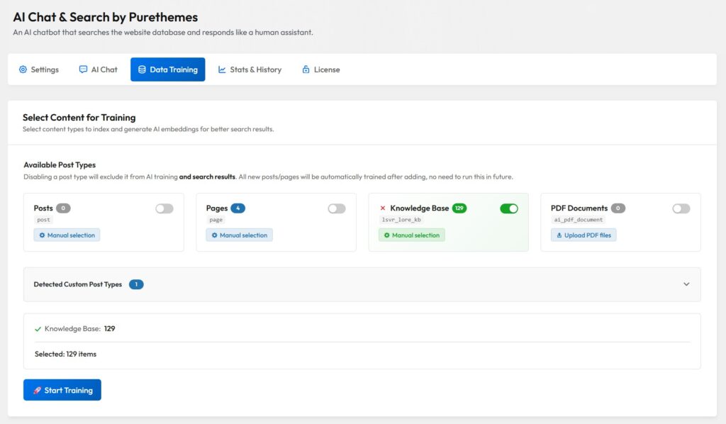 AI Chat & Search gestiona tipos de contenido personalizados, así que si tu sitio web/base de conocimiento usa CPT, no hay problema.