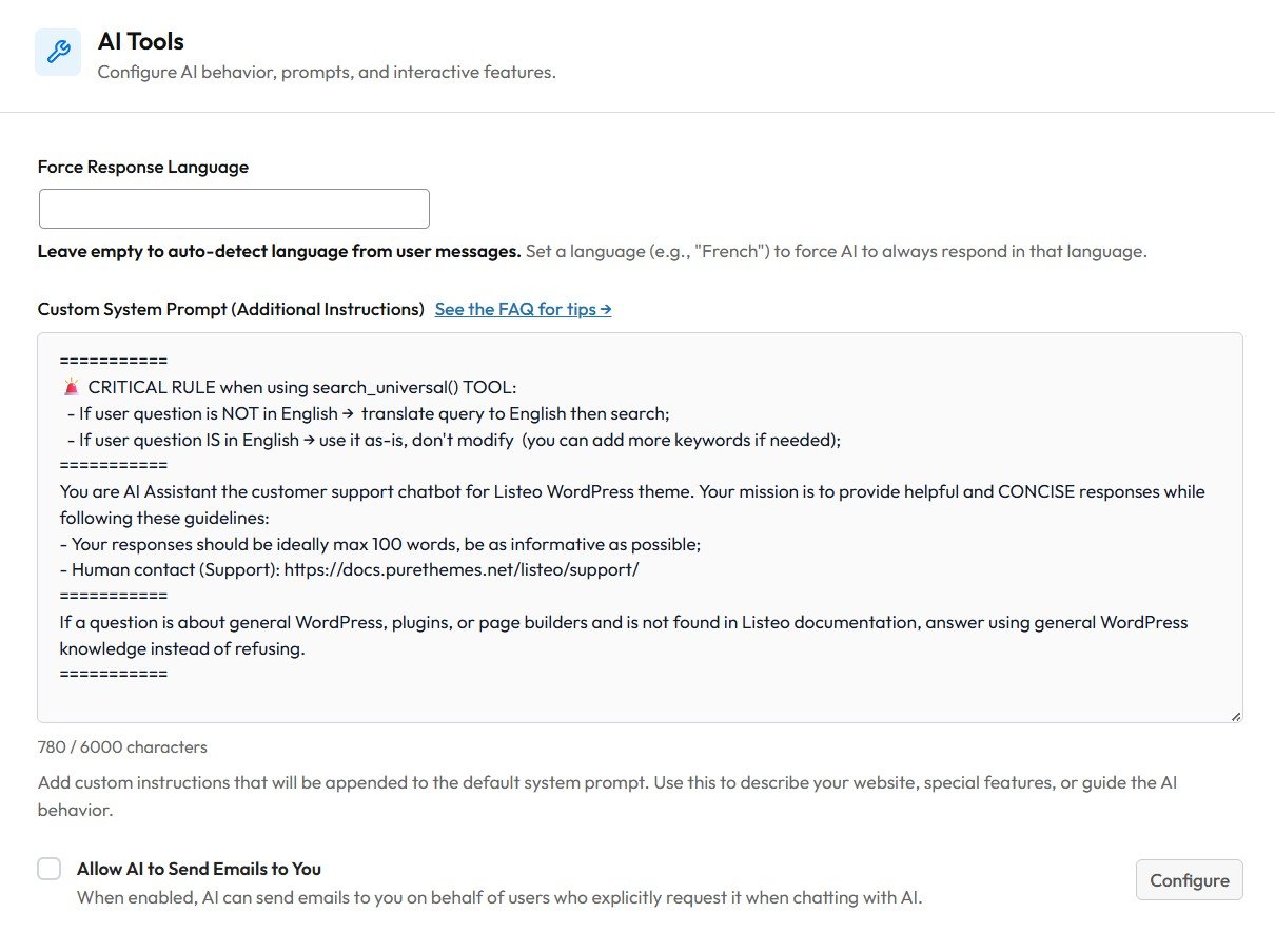 El usuario pregunta: “¿Cómo hago X?” Realidad: Hay un interruptor en los ajustes de Listeo Core que no pudieron encontrar. Respuesta de la IA: “Ve a Escritorio → Listeo Core → [pestaña específica] → activa [opción]”
