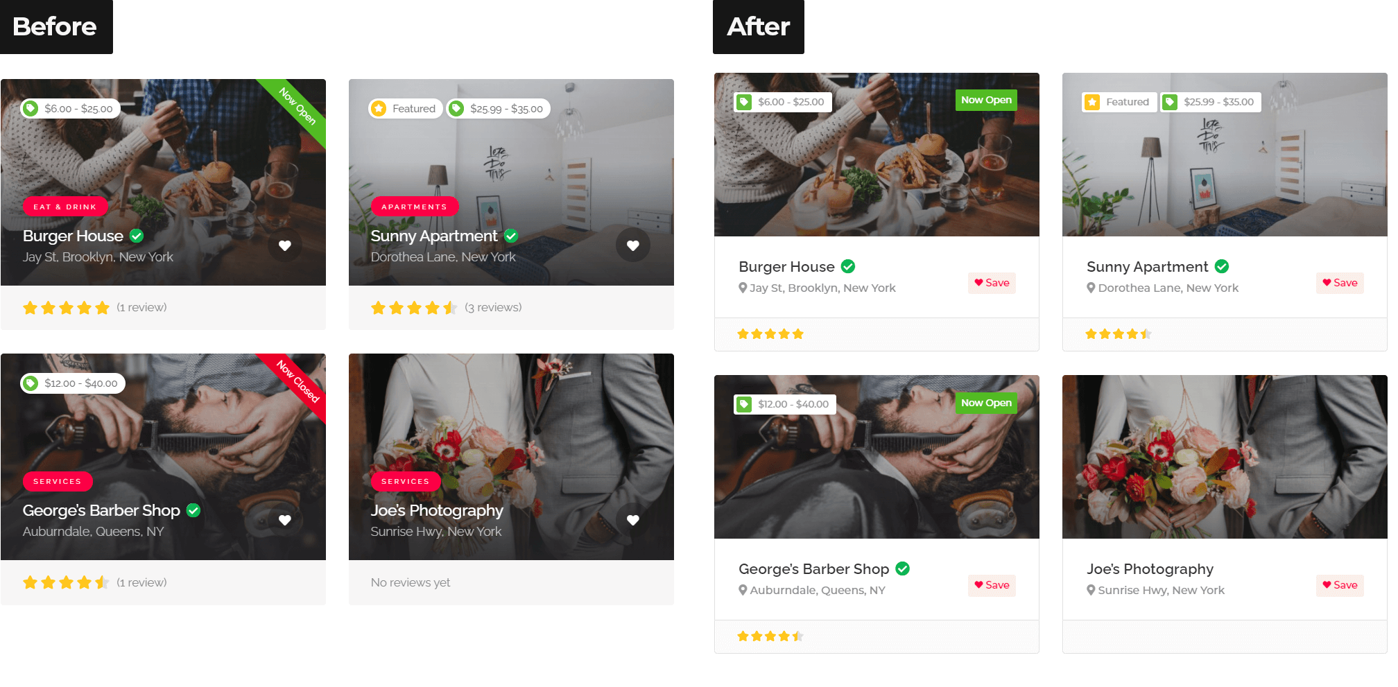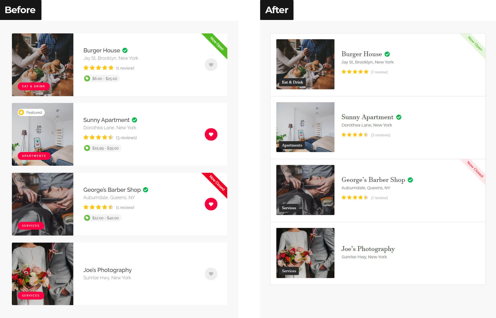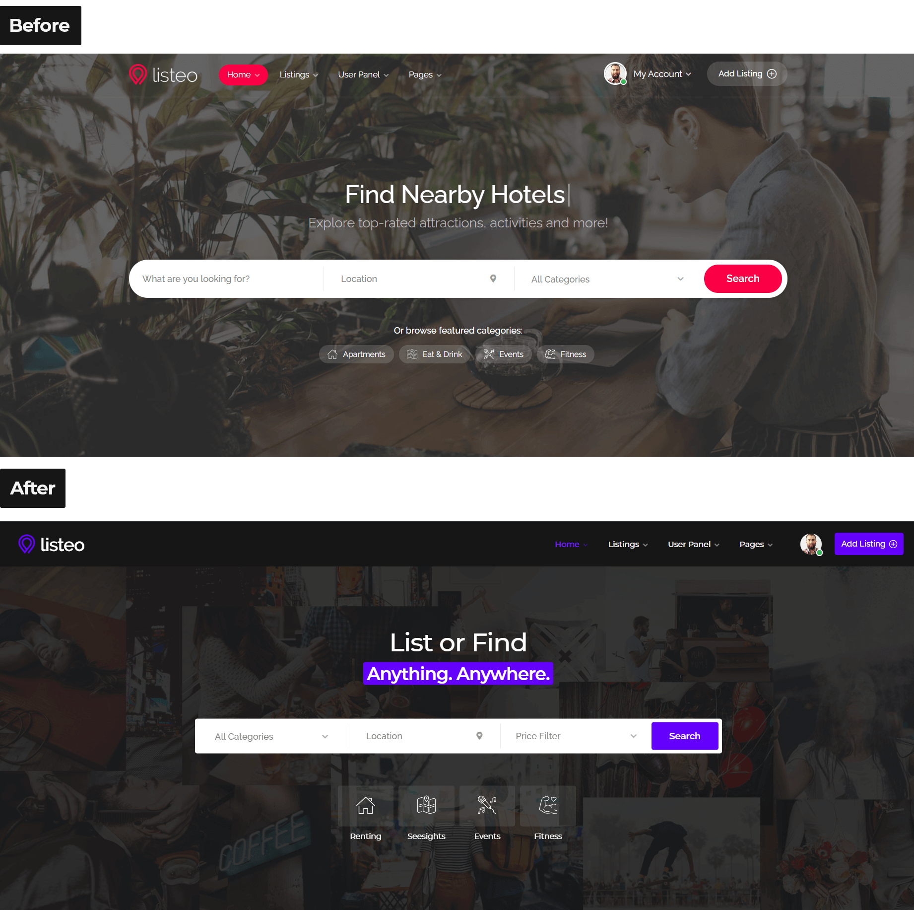 Redesign means changing visual aspects of specific element without modyfing functionality of that element. Do you want header or listing list layout to look different than default? No problem! We can change typography and colors, shapes of hovers, font size etc. according to your requirements. You just need to point us to the right direction e.g. by providing examples of other websites. 🙂