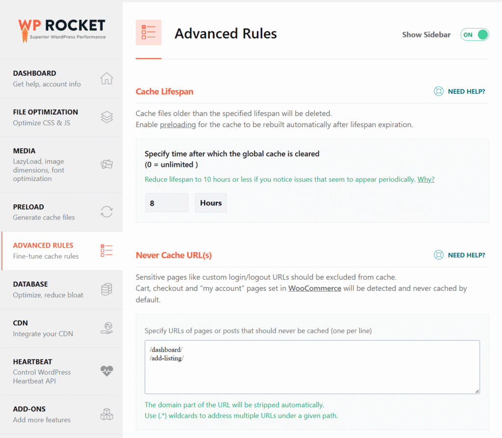 Never Cache URLs: For pages that must always be dynamic (like checkout pages, booking confirmations, or user dashboards), exclude them here.
