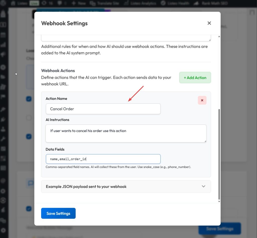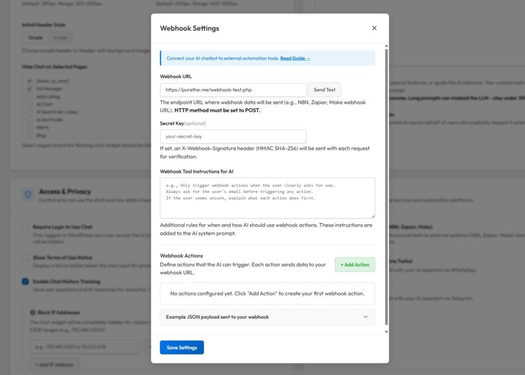 Go to your AI Chat Search Pro settings.Paste the webhook URL. Set a webhook secret and define your actions with required fields.